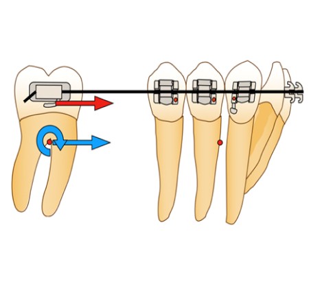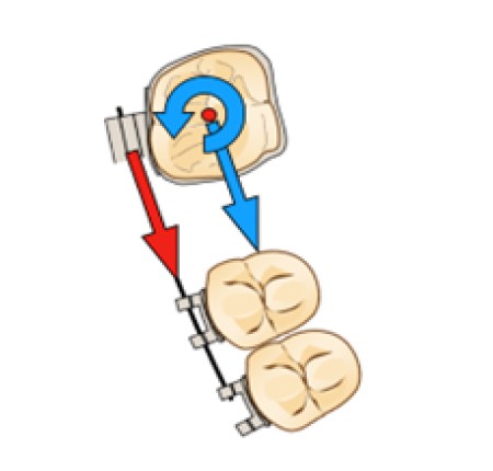 La situation clinique décrite dans les paragraphes ci-dessous est celle d’une mésialisation de deuxième molaire mandibulaire en place de la première molaire. Par convention, les forces appliquées seront représentées en rouge et les équivalences au centre de résistance (CR) en bleu.