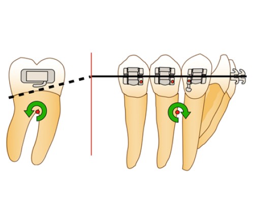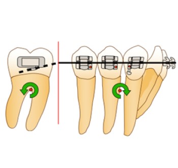 Dans la dimension antéro-postérieure, lorsqu’une force motrice est appliquée sur le tube d’une molaire, elle passe au-dessus de son centre de résistance, entraînant une mésialisation, mais aussi une mésio-version de celle-ci, jusqu’à un contact étroit entre le tube et l’arc (Fig. 1a). Dans le plan occlusal, le tube étant en vestibulaire par rapport au centre de résistance de la molaire, on assiste à une mésio-rotation de la dent (Fig. 1b).