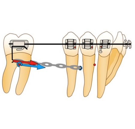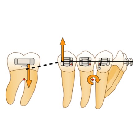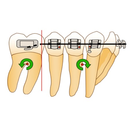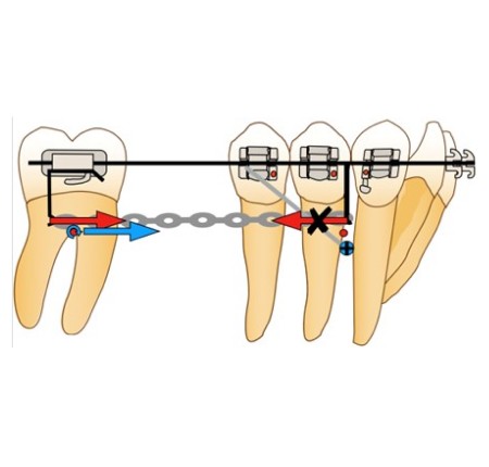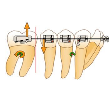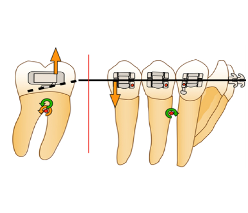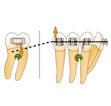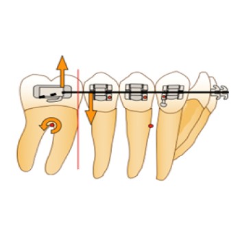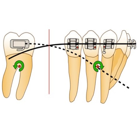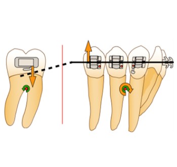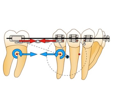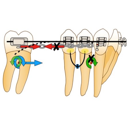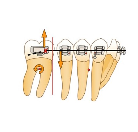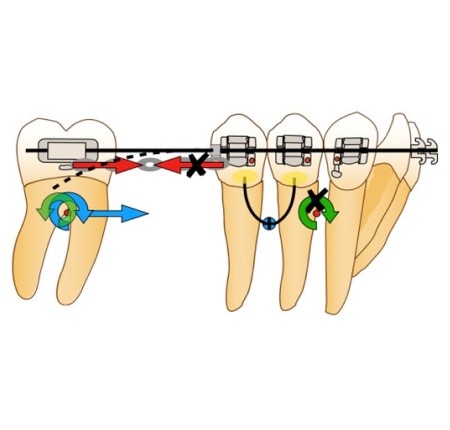 Afin d’éviter le risque de dérive mésiale de l’arcade par arc-boutement à l’entrée du tube de la molaire et la disto-version de la dent d’ancrage, la force motrice se doit d’être appliquée entre la molaire et l’arc lui-même. Ainsi, en cas d’arc-boutement, aucune dérive mésiale n’aura lieu, car la force motrice est appliquée entre deux points d’un même système et n’inclut pas un ancrage extérieur. De plus, la mini-vis peut alors être ligaturée à l’arc directement via un crochet afin d’éviter le déplacement distal de celui-ci ou à la dernière dent du bloc d’ancrage, en vue d’éviter la perte d’ancrage de ce dernier.