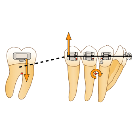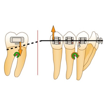 La configuration en V asymétrique obtenue imprimera une force ingressive à la molaire et une force égressive au bloc antérieur accompagnée d’un moment de rotation horaire. Les forces verticales ainsi exprimées, dues au système en V asymétrique, peuvent alors être à l’origine d’une bascule non-recherchée du plan d’occlusion, en cas de mésialisation molaire unilatérale.