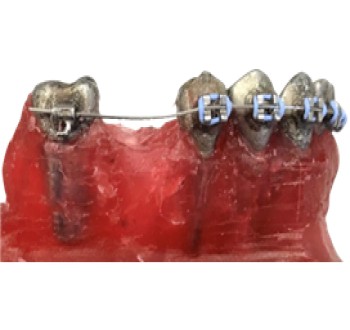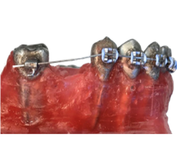 La mini-vis peut aussi être directement ligaturée à l’arc par l’utilisation d’un crochet serti sur ce dernier. Dans ce cas de figure, la force de traction se doit d’être appliquée sur l’arc lui-même, afin d’éviter le mouvement distal le long de l’arc de la prémolaire d’ancrage. Dans cette configuration, on peut alors avoir recours à un stop serti en distal de cette dernière.