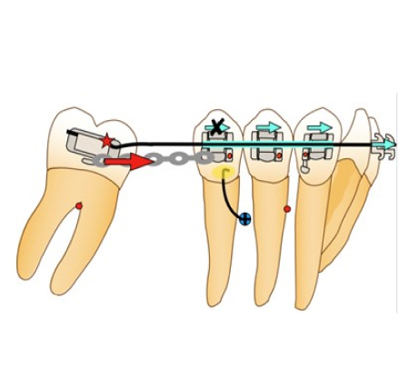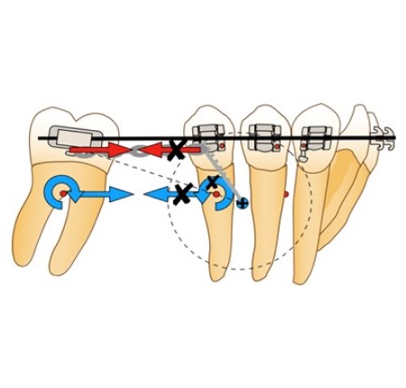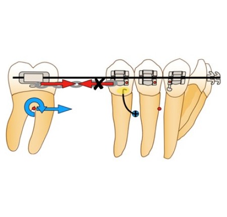 Nous allons, au travers de cet article, décrire les différents systèmes de mésialisation molaire en technique multi-attache vestibulaire, en exposant la biomécanique de chacun d’eux. Pour chacun des exemples, la molaire à mésialer représentera la résistance mobile tandis que la mini-vis, reliée ou non à un bloc de dents, suivant son utilisation directe ou indirecte incarnera la résistance stabile.